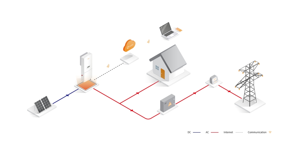 Hệ thống sẽ chuyển hóa thành nguồn điện một chiều (DC) từ các tấm pin năng lượng mặt trời thành nguồn điện xoay chiều (AC) thông qua bộ chuyển đổi điện (inverter) để cung cấp cho thiết bị điện.